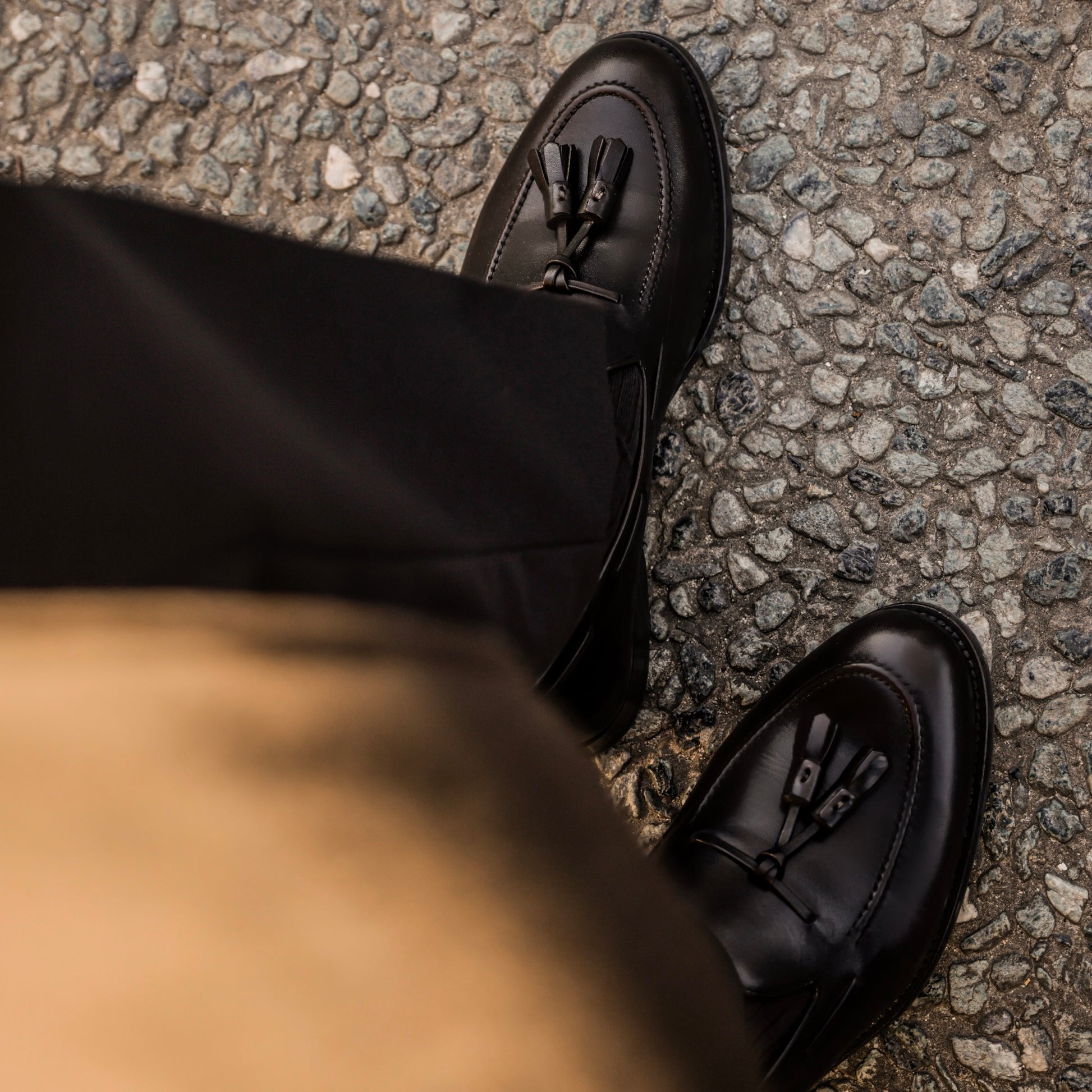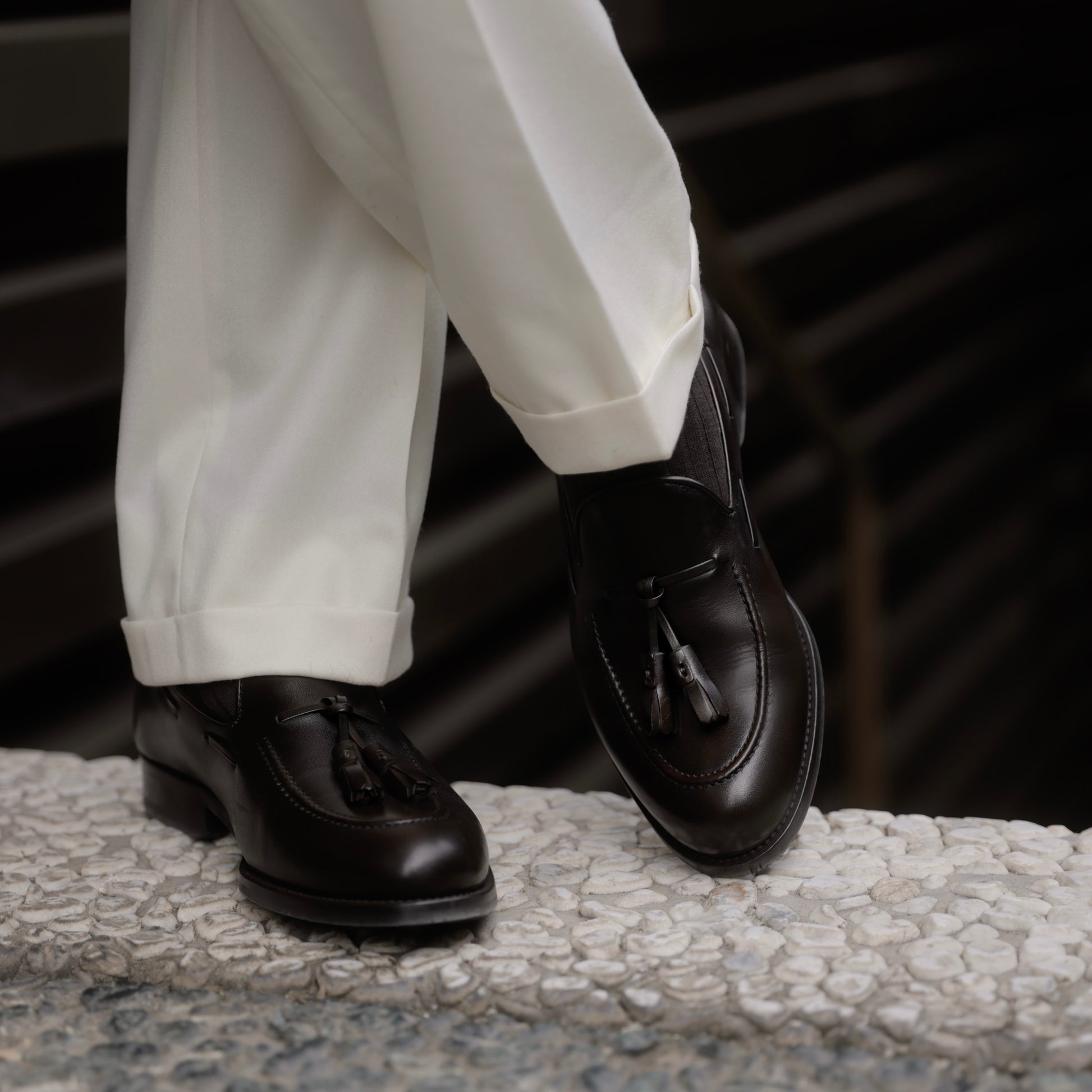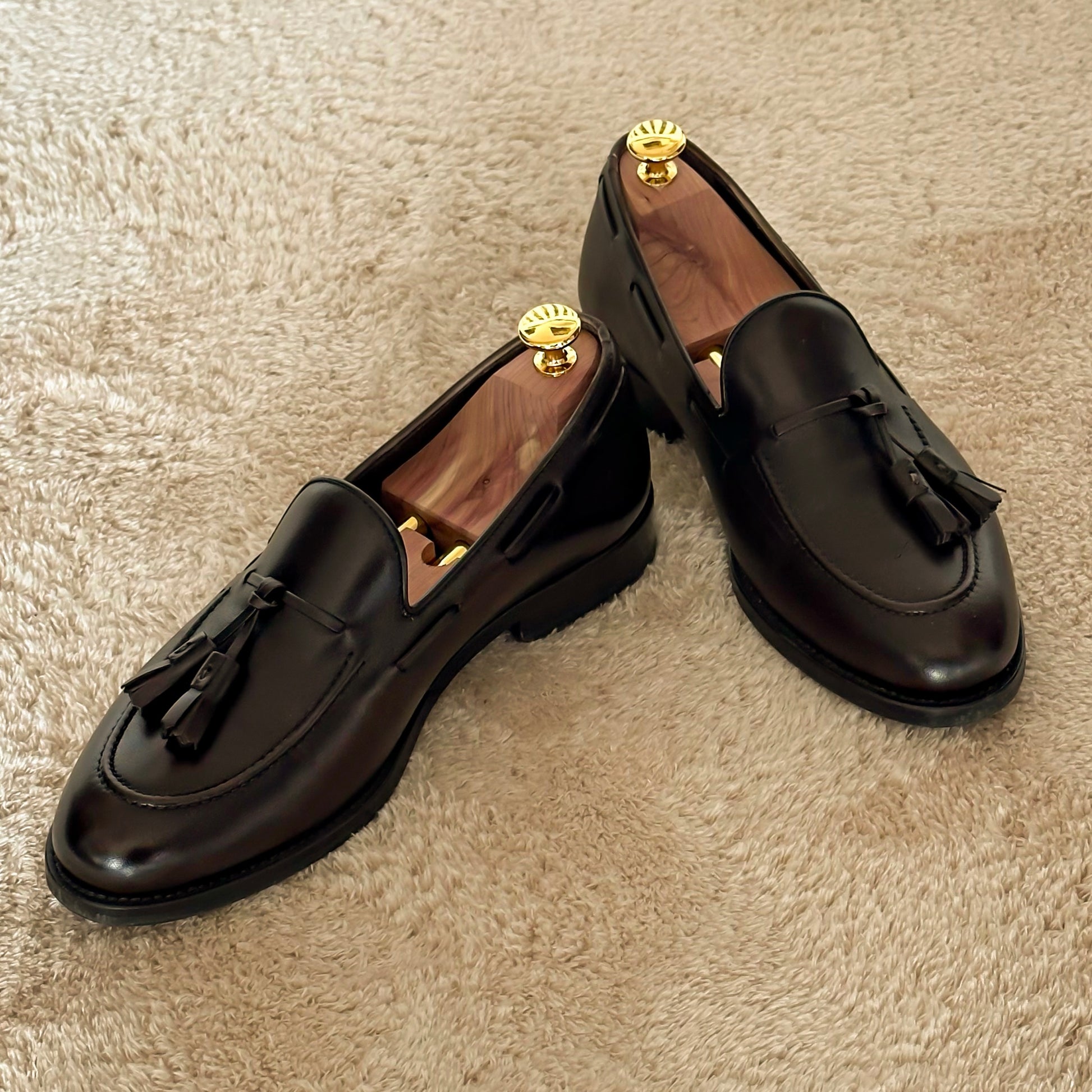 Size GuideHandcrafted Dark Brown Lux Calf Tassel Loafer. Classic British Rounded Toe. Leather and rubber sole. Dark brown leather insole. Exclusively made to order.